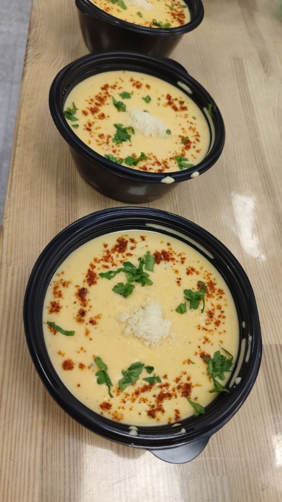 Склад: капуста білокачанна варена, крупа рисова варена, філе стегна куряче, цибуля ріпчаста смажена, морква смажена, олія соняшникова рафінована, сіль кухонна, перець чорний мелений, петрушка. Алергени підкреслено.